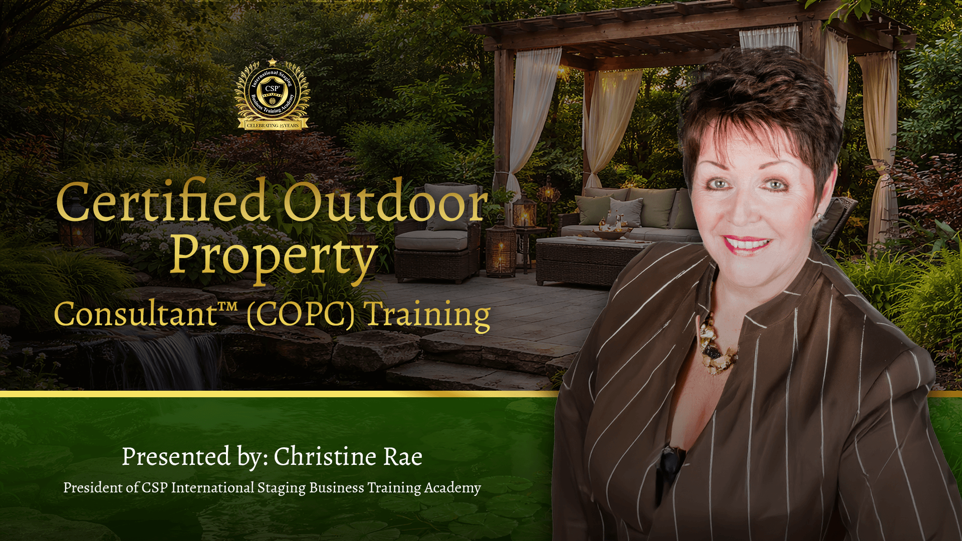 This certification is taught by Christine Rae, President of CSP International Staging Business Training Academy, founder of the CSP Staging Certification Program, a RESA Top 100 Industry Influencer, and best-selling author of Home Staging for Dummies.